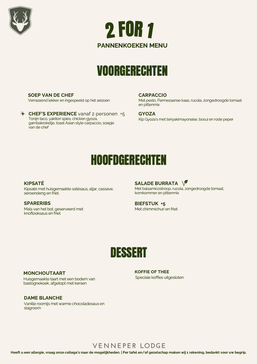 We hebben twee fantastische menu's beschikbaar bij Venneper Lodge. De actie 2 FOR 1