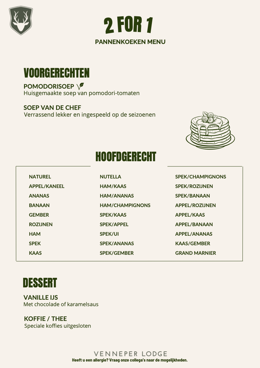 Kies voor het heerlijke pannenkoeken menu bij Venneper Lodge. Speciaal samengesteld zodat je maximaal kunt genieten. Wat zit er bij inbegrepen: